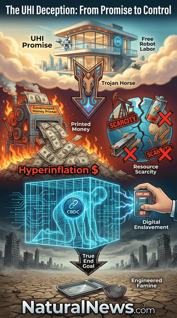 So if UHI leads to economic ruin and ignores physical reality, what is its true purpose? Follow the money to the real agenda: control, enslavement, and ultimately, depopulation. UBI/UHI is not about prosperity; it’s the perfect control mechanism for a coming Central Bank Digital Currency (CBDC)-based surveillance grid. In this system, your entire financial existence is programmable. Your ‘income’ can be shut off for non-compliance — for refusing a vaccine, for criticizing the government, for any reason the authorities deem fit [8].